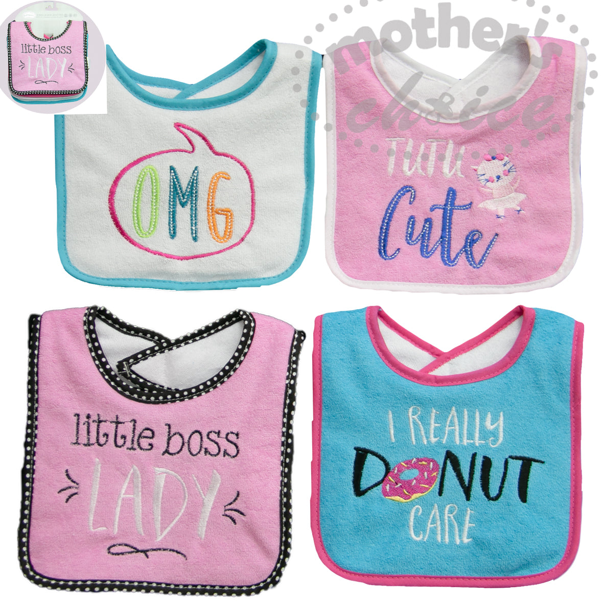 4 PACK EMBROIDED DRIBBLE PROOF BIBS - LITTLE BOSS LADY