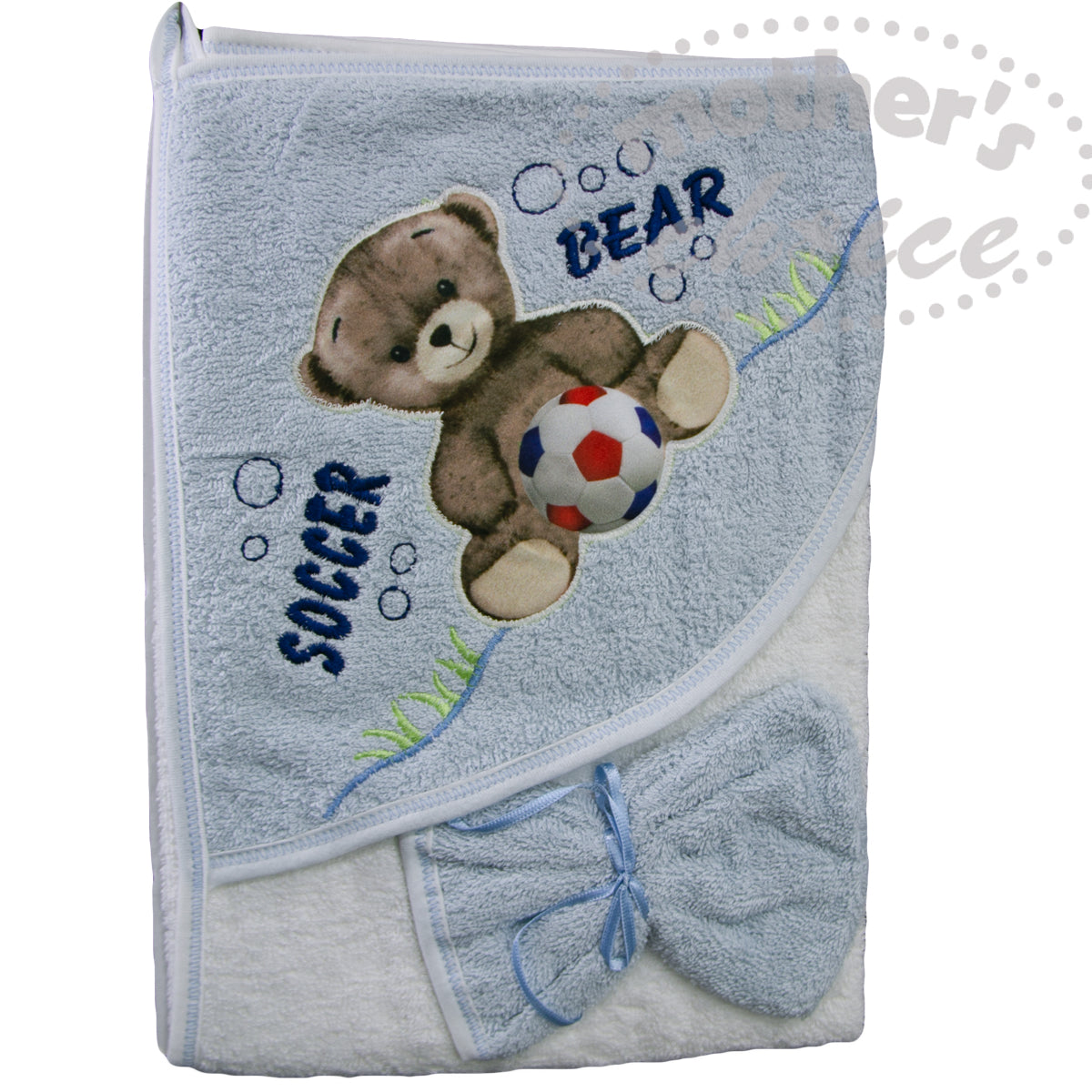 HOODED TOWEL AND FACECLOTH 'SOCCER BEAR'